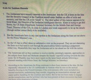وتكشف الوثائق، في أحد أكثر أجزائها حساسية، أن الملك عبد الله كان يأمل في استعادة دور هاشمي في العراق بعد سقوط صدام، وقد حذّر مستشارو بلير رئيسَ الوزراء من أن مدير المخابرات الأردنية آنذاك سعد خير كان يشجّع الملك على استكشاف هذا السيناريو.