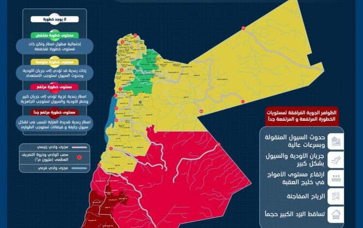 اطلعت وزارة الإدارة المحلية على تقارير دائرة الأرصاد الجوية والخرائط الصادرة عن نظام الإنذار المبكر، والتي أظهرت تفاصيل حالة عدم الاستقرار الجوي المتوقعة اليوم السبت في مختلف مناطق المملكة، وما قد يصاحبها من أمطار رعدية غزيرة وخطر تشكّل السيول والفيضانات.